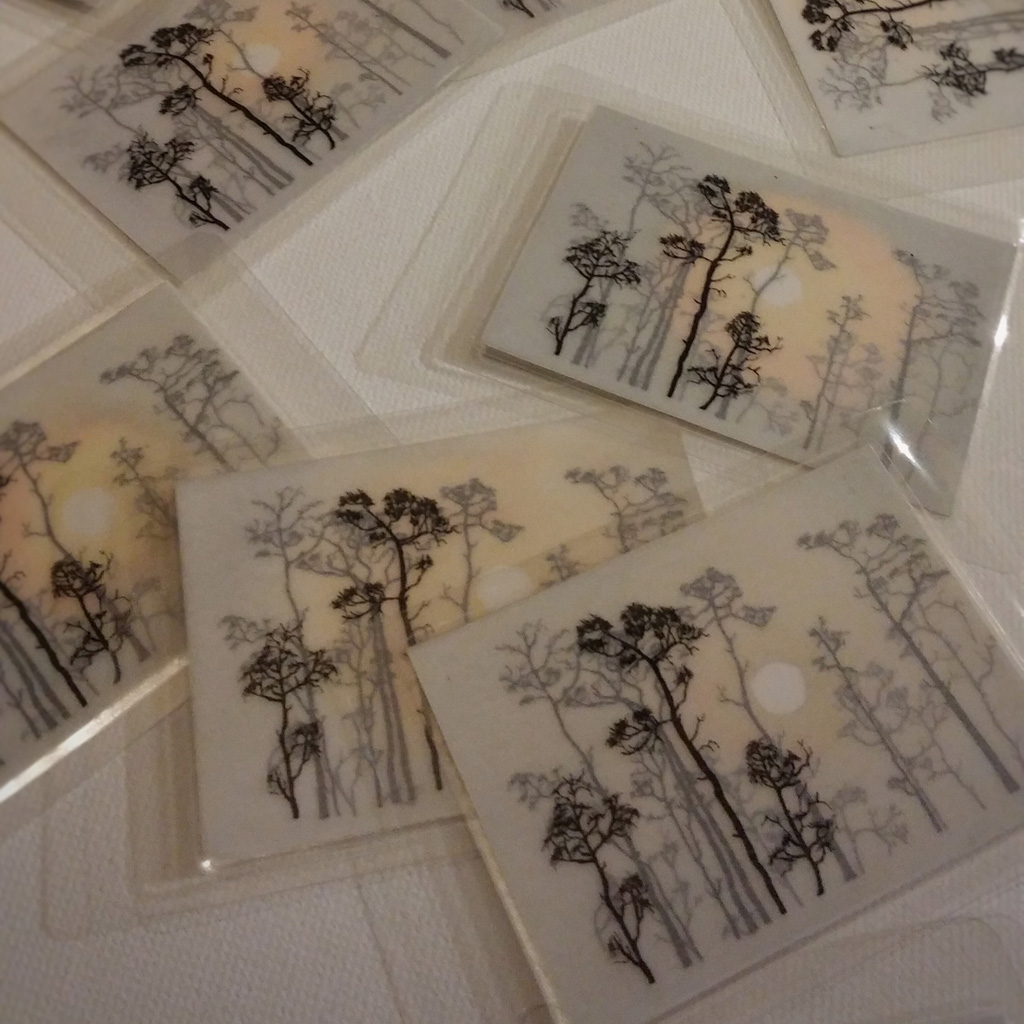 Druck einer Zeichnung auf 3 Lagen Transparentpapier, Aquarellmalerei, laminiert.