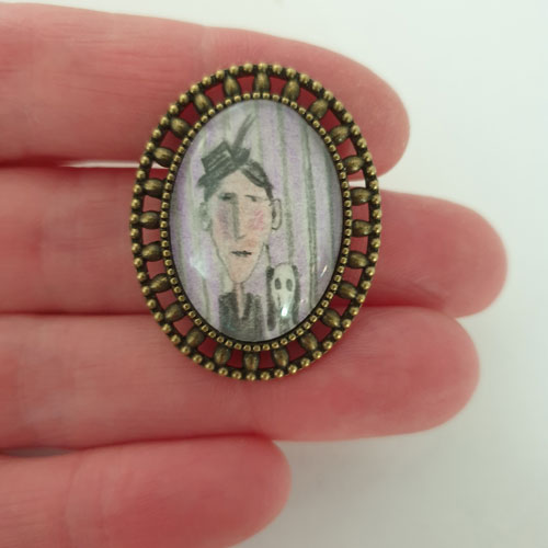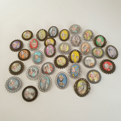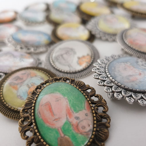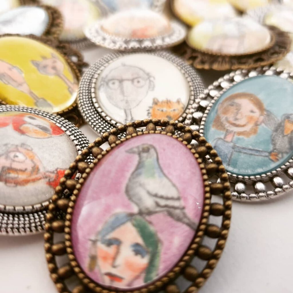 Kleine nicht ganz ernst zu nehmende Broschen und Anhänger mit witzigen Zeichnungen in Buntstift.